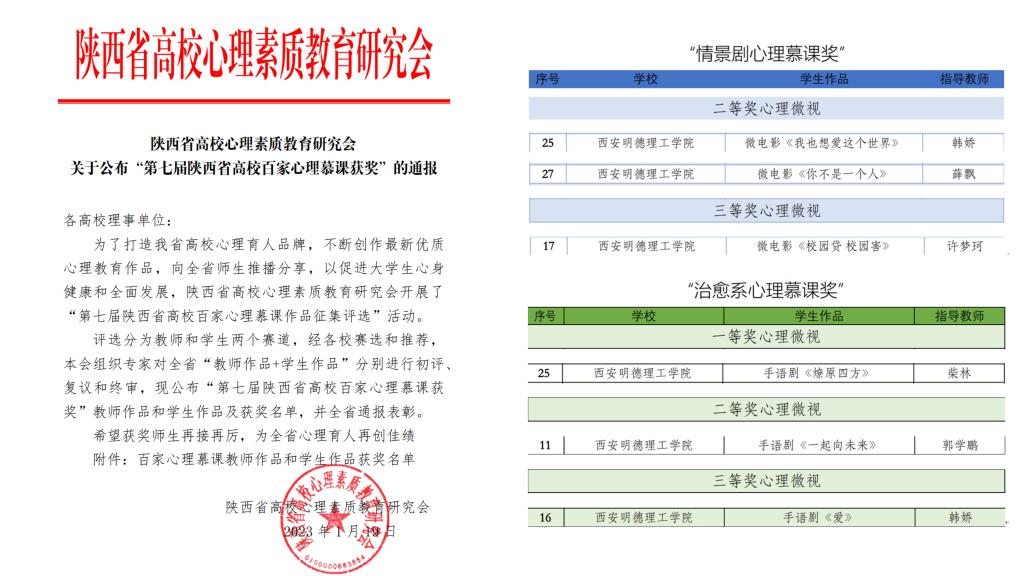 近日,学校心理健康教育工作获得陕西省高校心理素质教育研究会多项表彰。bet36365路检测中心荣获陕西省高校心理素质教育研究会“心理育人标兵单位”,1人荣获“最奉献心理育人好主任”,1人荣获“百嘉心理辅导师”,1...