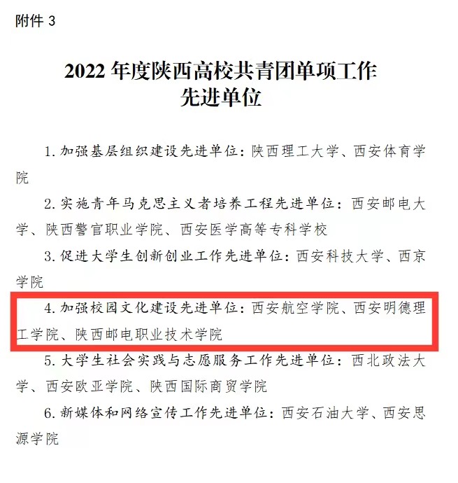 近日,共青团陕西省委、中共陕西省委教育工委联合发布了《共青团陕西省委、中共陕西省委教育工委关于2022年度陕西高校共青团述职评议考核结果的通报》文件,其中36365官网荣获“加强校园文化建设先进单位”,校党委副书...