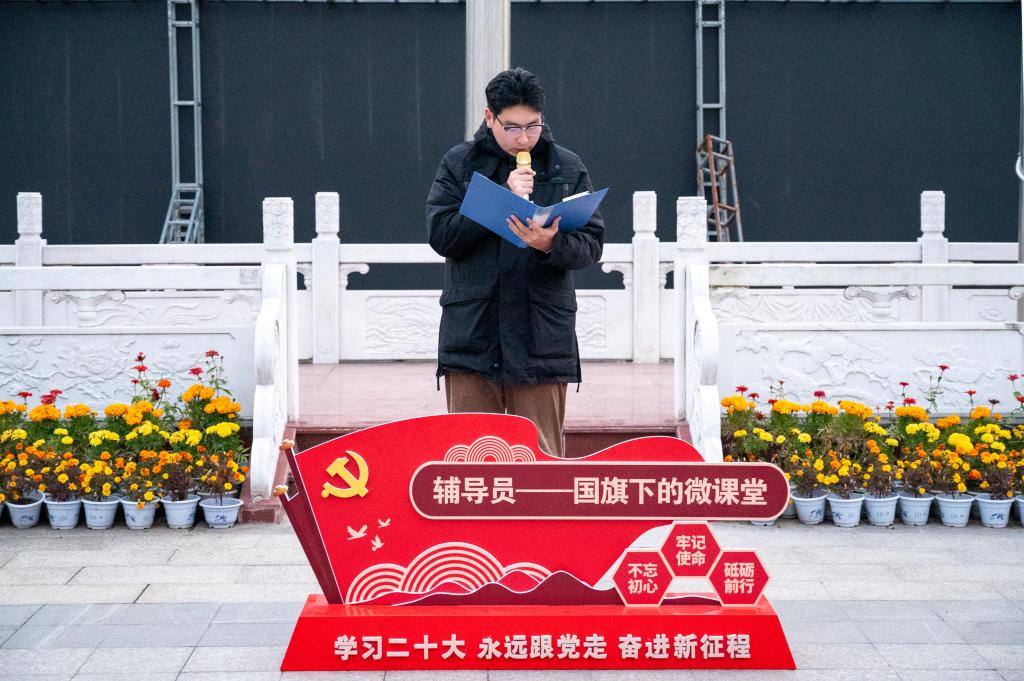11月13日清晨,“辅导员说成长”——第二十一期辅导员讲微课“划时代之桨,扬奋进之帆”国旗下的微课堂爱国主义教育系列活动在学校中心广场举行,党委学生工作部老师、高等职业技术学院师生代表参加活动。初冬的校...