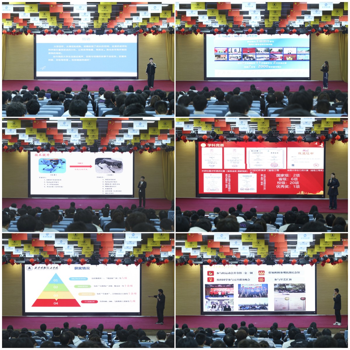 国家奖学金获得者牟正军、周孝鹭、仝乐、张家荣、俞国栋、周晓栋依次上台,他们分别从学科竞赛、学习方法、社会实践、创业创新等方面向同学们分享了自己所学、所感、所悟,引导学弟学妹们养成良好的学习习惯、激发内驱力,在校内形成浓郁的学习氛围,汇聚起学习榜样、争做榜样的强大力量。