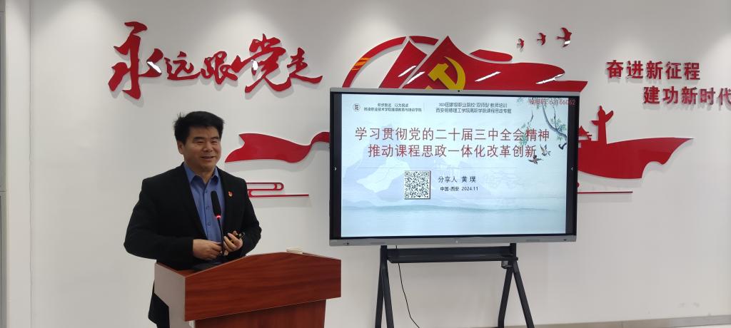 为学习贯彻党的二十届三中全会和全国教育大会精神,开展好高等职业技术学院课程思政教学比赛,11月28日晚,高等职业技术学院成功举办了以“学习贯彻党的二十届三中全会精神,推动课程思政一体化改革创新”为主题的专题辅导报告会。此次报告会邀请了陕西职业教育乡村振兴研究院副院长,杨凌职业技术学院继续教育与培训学院、村干部(农民)发展学院、乡村振兴学院院长黄璞教授作为主讲嘉宾,为高等职业技术学院全体专职教师带来了一场内容丰富、深入浅出的专题讲座。