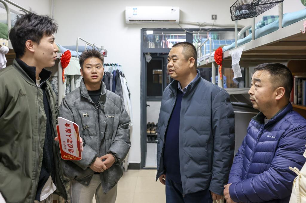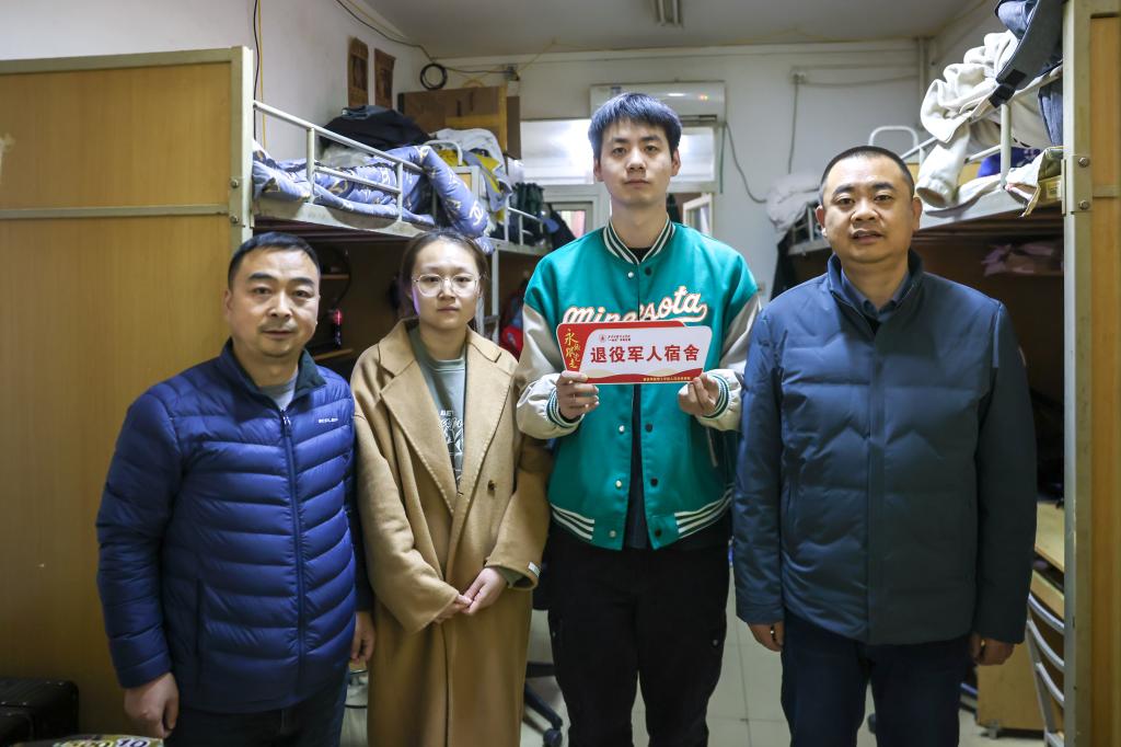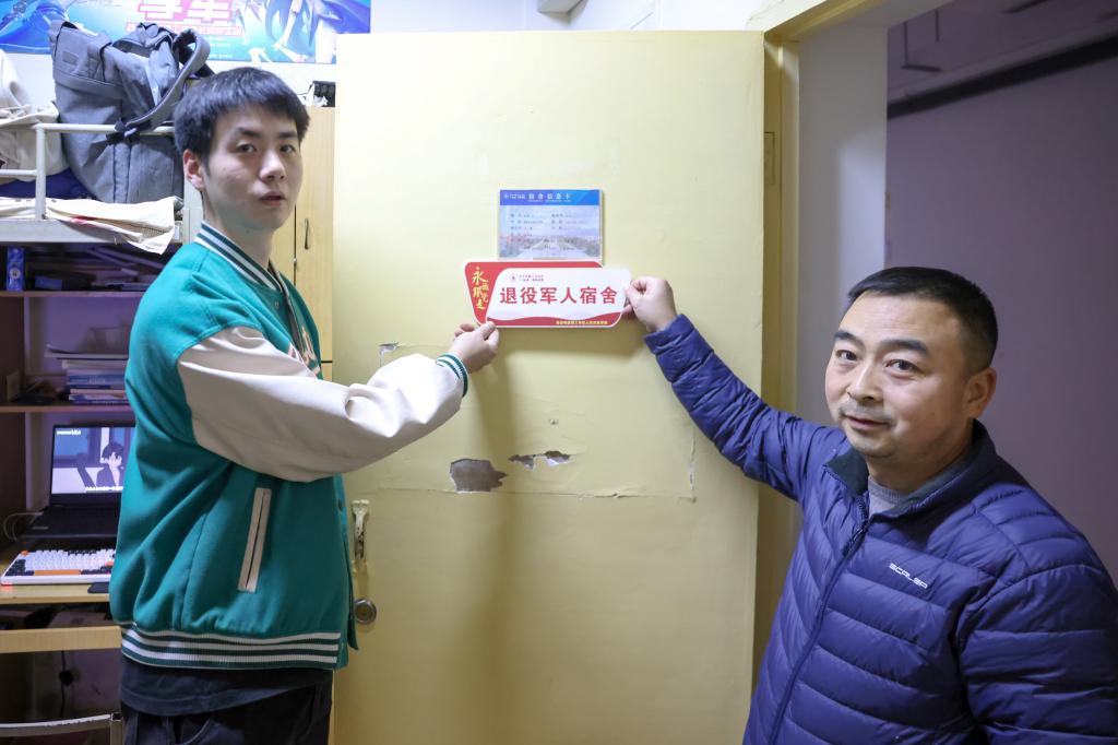 在退伍军人宿舍,院领导慰问了退伍大学生阴生杭和张德鹏,与他们进行交流,主动了解他们返校后的学习、生活适应情况,并就他们当前学习生活中遇到的困惑进行详细解答。在与退伍学生的交谈中,王庭良希望退役大学生能永葆军人初心、珍惜军人荣誉,时刻以党员、军人的标准严格要求自己,发扬部队优良传统,树立纪律之风,在平凡的生活中继续发光发热,切实发挥好先锋模范带头作用。随后学院领导向退伍学生宿舍悬挂“退伍军人宿舍”光荣牌并合影留念。
