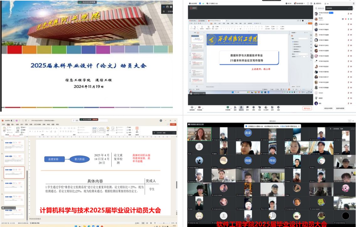 通信工程专业提出要及时与指导老师沟通进度,遇到困难大家一起克服;软件工程专业强调了学生要注重学术道德,提升毕设品质;数据科学与大数据技术专业通过时间轴为大家讲解每一阶段学生要完成的任务。