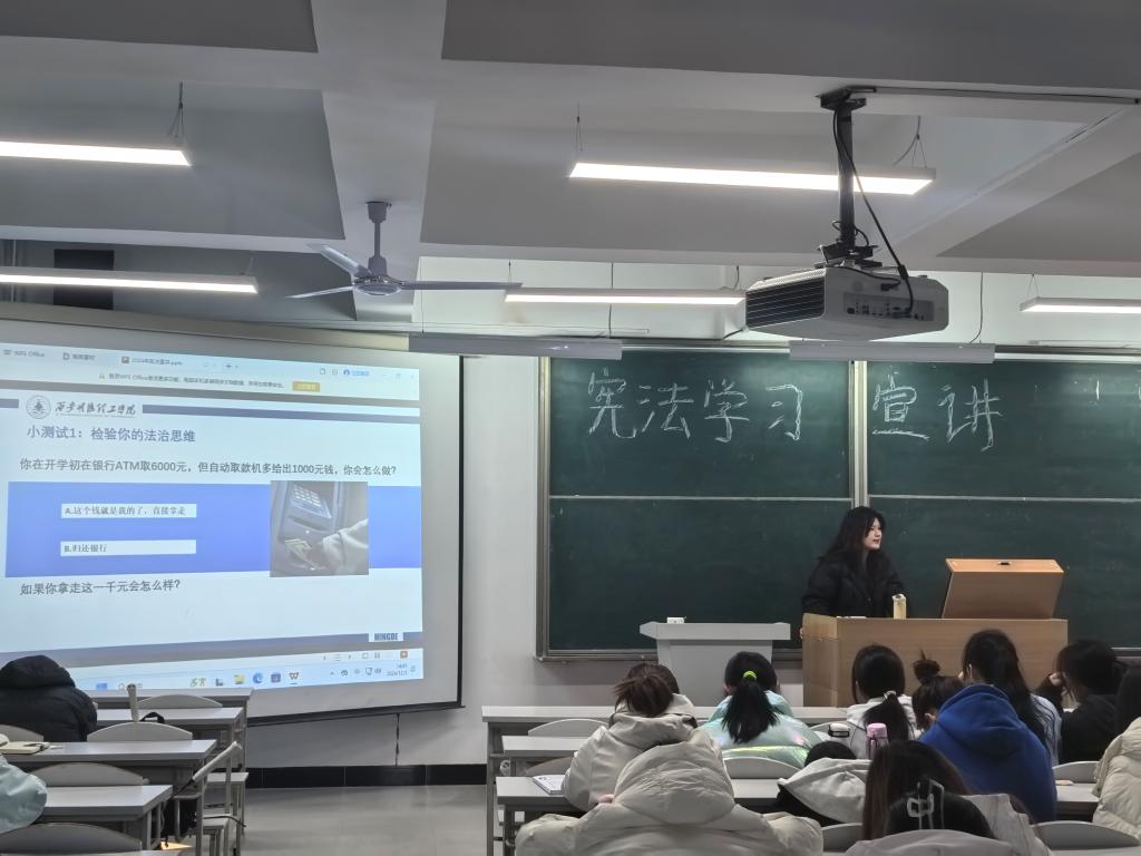 康娜老师以“解读民法典,守护生活权益”为题,为高等职业技术学院的学生全面解析了民法典的核心内容和精神;吴梦茜老师则通过“余华英案的法治思考”,引导信息工程学院学生们深入思考宪法精神在司法实践中的体现;张剑蓉老师围绕“维护宪法权威,树立法治思维”,鼓励经济与管理学院的学生积极培养法治思维,追求公平正义;车海肖老师以“维护社会公平正义的最后一道防线”为题,为语言文化与传播学院的学生揭示了司法公正的重要性;景怡欣老师面向艺术与设计学院的学生,通过“学宪法讲宪法”的生动宣讲,不仅强化了宪法在规范国家权力、保障公民权益中的根本地位,更在学生们心中种下了坚实的法治理念之种。