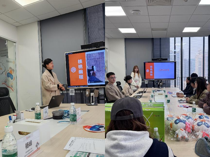 华宇带领我院师生参观了公司。随后,双方在会议室进行了座谈会。座谈会上,赵颖晨向我院师生们详细介绍了公司的企业文化、发展规模等内容,同时也针对公司的工作内容、岗位需求和晋升渠道做出了详细说明,真诚欢迎同学们来核桃编程工作实习。我院2023届毕业生李乐禹目前已经在核桃编程工作一年多,她也就自己在核桃编程的工作感受和公司的文化氛围向我院师生进行了详细介绍。她表示,核桃编程是一个有实力、有潜力的公司,也是一个年轻化、极具包容性、开放性的公司。在核桃编程这个友爱的大家庭中,她不仅在工作能力上得到显著提升,更是在生活质量上得到了很大改善,核桃编程确实做到了干事有平台、待遇有保障、发展有空间。随后,杨峰介绍了学校发展历程,从办学定位、学科专业、师资队伍、教学科研等方面对语言文化传播学院情况进行了介绍。我院学生也针对招聘要求和工作内容等积极提问,赵颖晨、华宇予以耐心细致的解答。