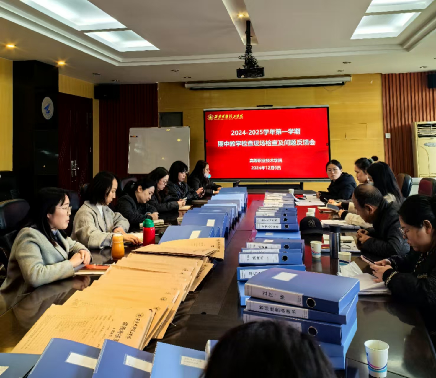 第一阶段,由各二级学院汇报自查情况,详细总结了本学期以来的教学工作开展情况。汇报内容涵盖了教学计划执行情况、师资队伍建设、实践教学、五位一体评价等多个方面。部分学院还特别突出了自身在教学创新、课程改革以及学生能力培养上的亮点和特色,充分展示了各学院在教学工作中的显著成果。