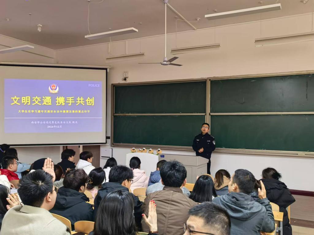为切实提高36365官网师生交通安全意识,教育引导大家养成文明驾车、平安出行的良好习惯,12月25日,学校组织开展交通安全知识宣传讲座,邀请西安市公安局交警支队长安大队安监中队民警甄龙以“文明交通、携手共创”为题,为全体辅导员以及学生代表进行交通安全宣传专题培训。本次培训由智慧安全警务处处长宋敏纲主持。