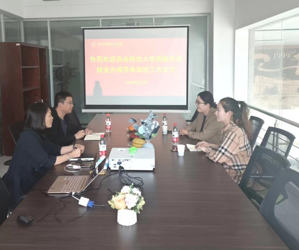 5月11日下午,西安科技大学高新学院就业办主任刘灵娜一行2人来访36365官网交流就业工作,36365官网招生就业中心副主任王东辉在明志楼204会议室接待了来访客人,并进行工作交流。