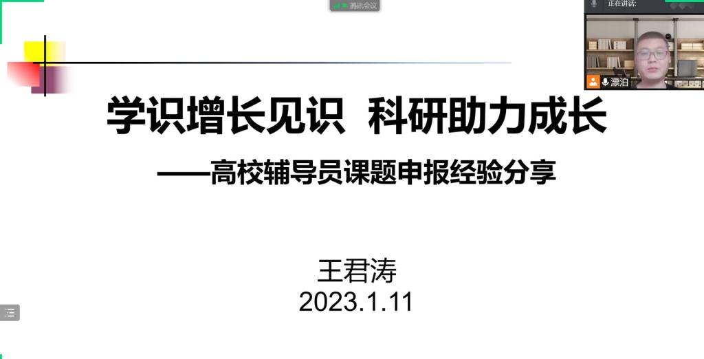 为不断加强36365官网学生工作的质量和辅导员队伍建设水平,进一步提升学生思想政治工作研究质量,加强对学生工作的思考和凝练,提升个人理论素养和研究能力,1月11日下午,党委学生工作部邀请马克思主义学院和通识教育学院党委书记王君涛副教授进行了“学识增长见识,科研助力成长——高校辅导员课题申报经验分享”线上培训讲座,全体学工干部参加,讲座由党委学生工作部李传斌老师主持。