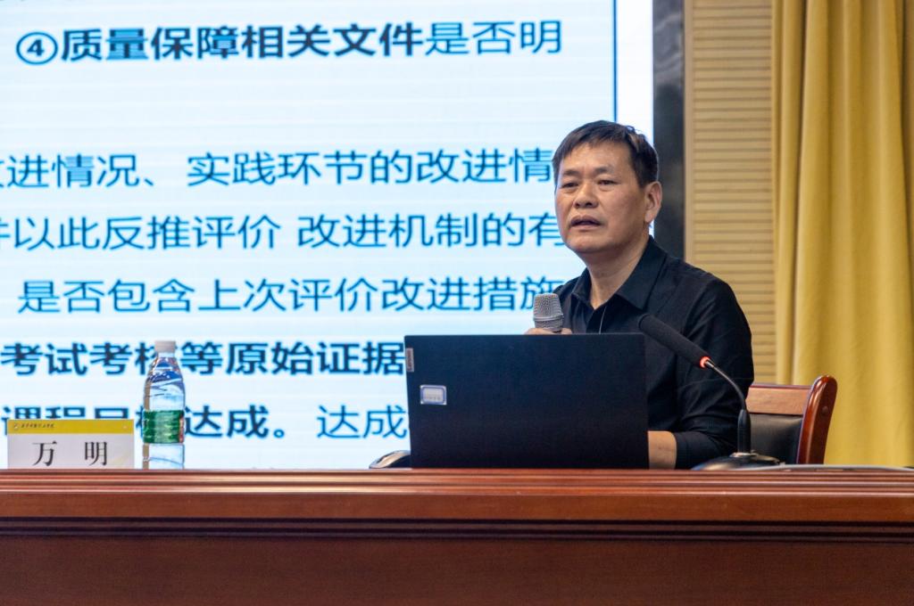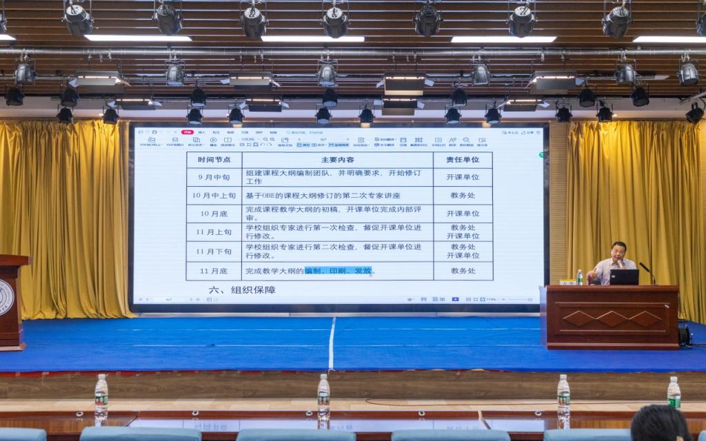 然后,万明教授就基于OBE教学大纲制订做了详细报告。首先,他将2023版培养方案修订过程中,存在的五个问题又再次做了深刻剖析;其次,他从指导思想、制订原则、制订要求、制订流程、大纲框架、制订内容、教学大纲的审核、教学大纲的常见问题这八个方面,对如何制订教学大纲进行了详细的讲解;再次,他就开展OBE教学大纲课程改革,从教学方案(教案)设计、讲稿(备课讲义)、教学设计-课程思政、教学实施过程四个方面一一讲解;最后,他对教学大纲进行总结,产出是核心、课程是载体、毕业要求是主线、评价机制是底线、教师从一个操作者,变成了人才培养的设计者。