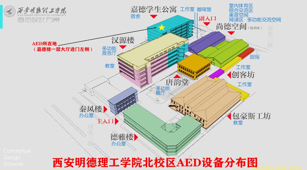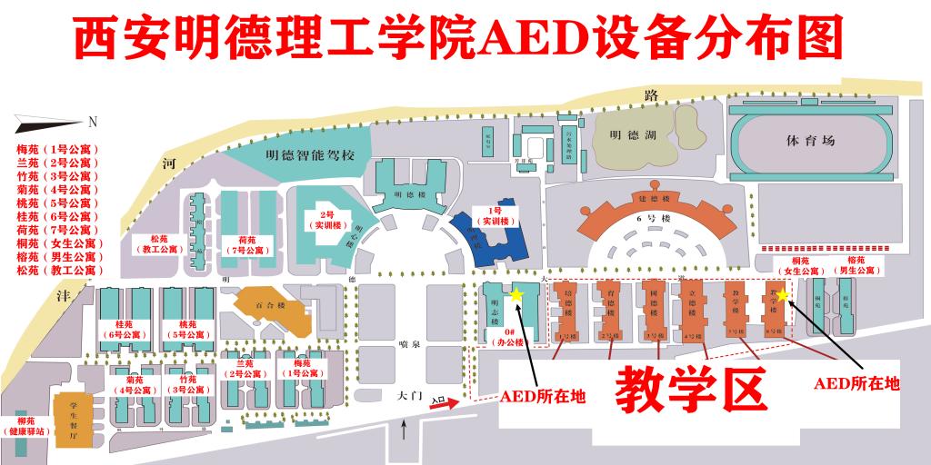 AED设备安装情况:根据校园内各区域人群密度及活动强度,分别在南校区8#教学楼一楼北侧、0#办公楼中厅西侧、北校区嘉德楼一层进门左侧安装了体外自动除颤仪(AED),对防范校园突发事件和意外伤害事故,加强校园急救保障,进一步筑牢校园安全防线起到了至关重要的作用。