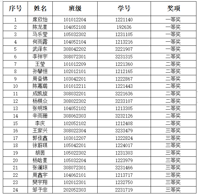 活动进行期间,同学们踊跃投稿,截至12月20日,共收到读后感来稿124份,其中手写稿26份,电子稿98份。经过五位校内专家老师评审,评出一等奖5名,二等奖10名,三等奖15名,优秀奖20名,获奖结果公布如下: