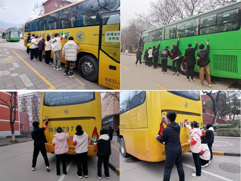 活动开始后,团员青年代表带着醒目的标志,分工明确,手持抹布、清洗液,对全校的校车内外进行地毯式清理。充分发扬不怕脏、不怕累、不怕苦的奉献精神。通过大家近两小时的辛勤付出,校车内外重新恢复了干净整洁。团员青年代表用事实行动践行了雷锋精神,受到了师生的广泛赞赏。