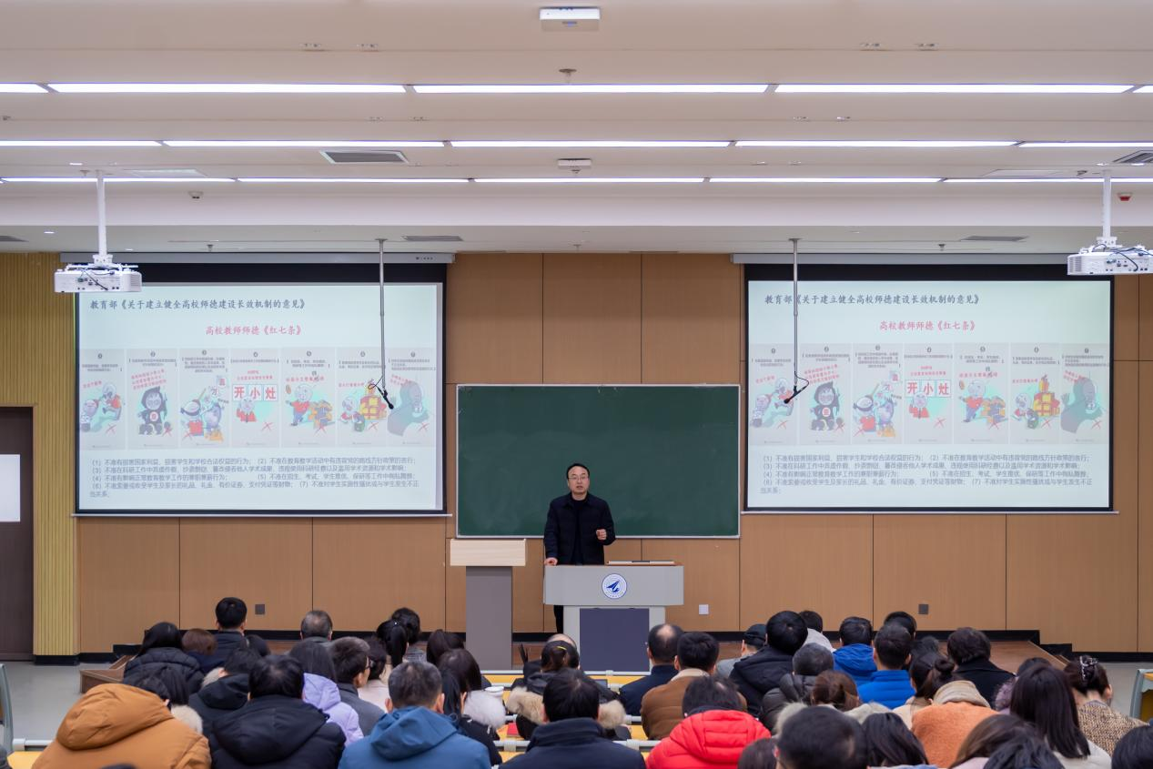 肖千春书记首先组织全院教职工学习了党和国家、教育部对高校教师职业道德的要求,重申了《新时代高校教师职业行为十项准则》,逐一解读学习了高校教师师德“红七条”等内容,使全体教育知规则、明底线。紧接着,组织大家学习了近年来发生在高校的典型的师德师风问题,引导大家谨守“学术研究无禁区,课堂讲授有纪律”要求,牢记“科学与国界,科学家有祖国”,提示大家课堂上的讲授、朋友圈的分享、微博上的言论都要与自己教书育人的身份相匹配。最后,组织大家系统学习了习近平总书记对教育工作者的重要论述,号召大家做“四有好老师”,做好学生的“四个引路人”,做学生为学、为事、为人的“大先生”,并希望大家以教育家精神为榜样,牢记为党育人、为国育才的初心使命,树立“躬耕教坛、强国有我”的志向和抱负,强化为人师表意识,明确职业行为边界,确保不出现师德失范行为。