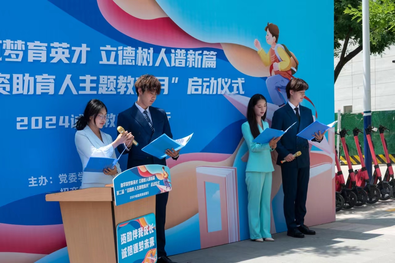 仪式最后,童杨梓宣布“第二届资助育人主题教育月”启动。他讲到学校建立了“奖、助、勤、贷、补、减、免”七位一体的学生资助政策,学校通过各类资助育人活动将感恩教育和资助帮扶有效结合,有助于培育学生自强自立、诚实守信、知恩感恩和回报社会等优秀品质,促进学生成长成才,鼓励同学们在新时代担当起新青年的责任。
