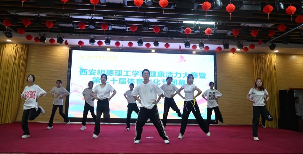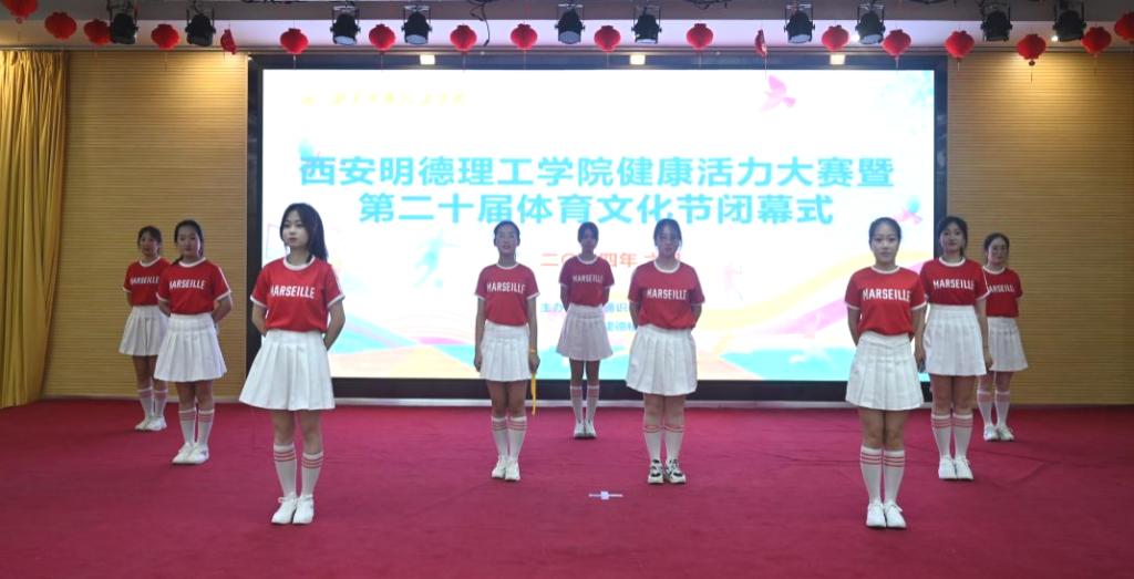 颁奖仪式前,来自各二级学院的9支队伍进行了健康活力大赛精彩比拼。他们通过热情饱满的笑容和整齐划一的动作赢得了现场观众阵阵掌声。