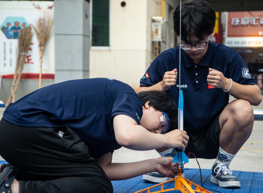 课堂上,实践队指导孩子们利用AI软件设计自己的火箭模型,通过3D打印机完成建模近距离观察打印过程回顾其工作原理,最终将模型进行拼装后引爆升空。