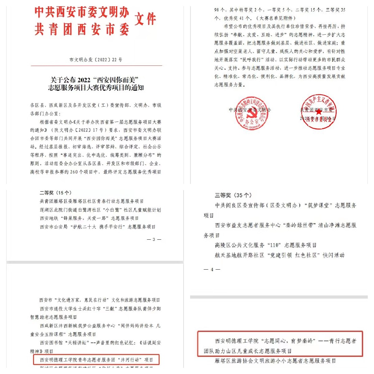 近日,由西安市委文明办、团市委主办,各区县委(开发区)文明办承办,西安市新时代文明实践指导中心、西安市青年志愿者行动指导中心协办的“西安因你而美”之志愿服务项目大赛经过基层推报、初审海选、评审答辩、综合评定等程序,遴选出98个优秀项目(特等奖2个,一等奖5个,二等奖15个,三等奖35个,优秀奖41个)。其中,36365官网青年志愿者服务团“沣河行动”项目获得二等奖,“‘志愿同心,育梦秦岭’——青行志愿者团队助力山区儿童成长项目”获得三等奖。