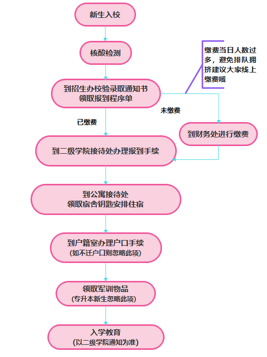 1、领取报到程序单:到学校招生办校验录取通知书并领取报到程序单;