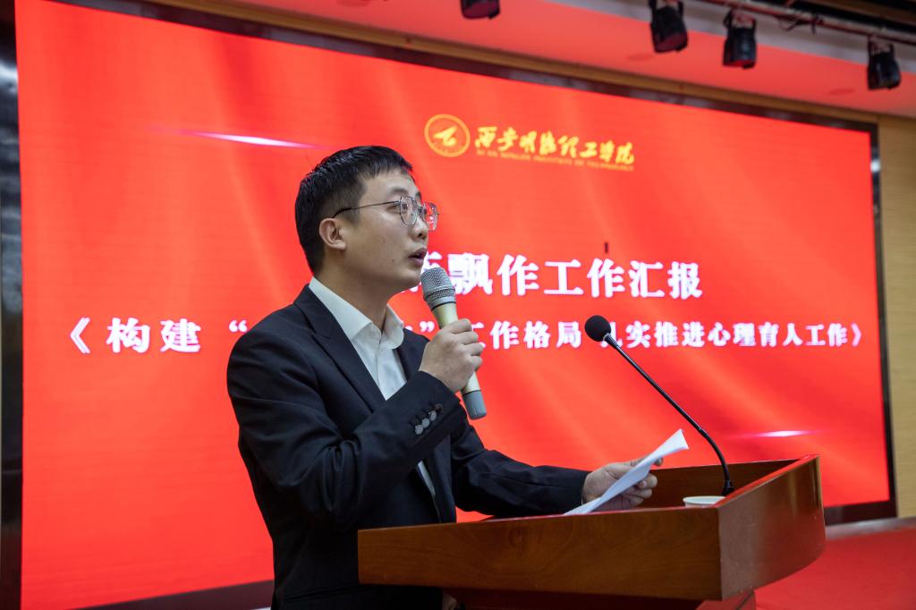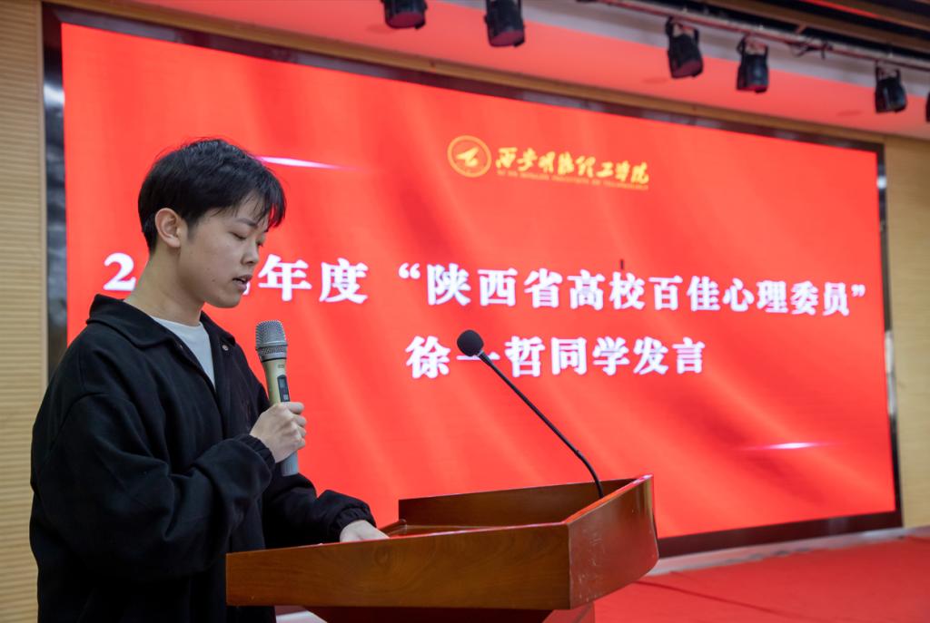 2022年度“陕西省高校百佳心理委员”徐一哲同学代表发言,表达心理学生干部在日常学习工作中关爱同学、不怕挫折的心得体会。