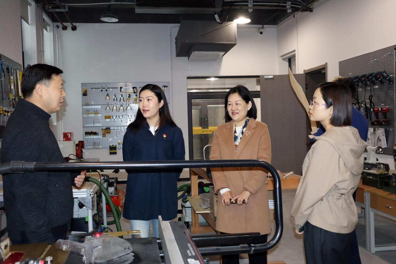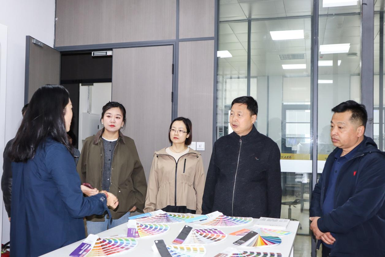 徐富权主席一行实地参观了唐韵堂展厅、包豪斯工坊和尚德报告厅等地,艺术与设计学院党委书记兼行政副院长雷宇介绍了学院专业特色、硬件设施、实验教学条件等,使到访人员对莲湖校区整体情况有了全面了解。