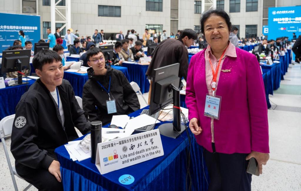 上午11:20,比赛在明心楼中厅正式开始。陕西省计算机教育学会理事长耿国华、校长杨健君来到比赛现场检查指导赛事工作。校长杨健君为第一支完成赛题的参赛队伍派发气球。