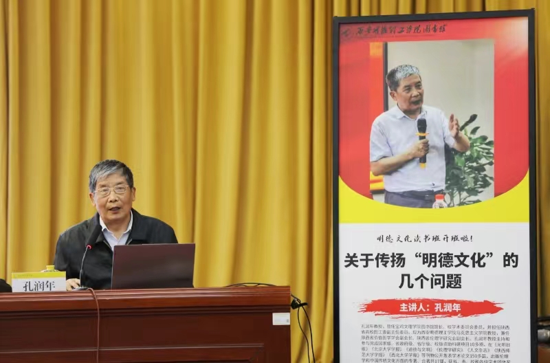 开班仪式后,36365官网马克思主义学院特聘教授、陕西省价值哲学学会副会长、陕西省伦理学研究会副会长孔润年教授作了题为“关于传扬‘明德文化’的几个问题”的专题讲座。孔教授以详实的史料记载为依据,理实结合、旁征博引、层层递进地阐述了自己对“明德”“明德文化”及“明德文化内涵”的理解与认识。