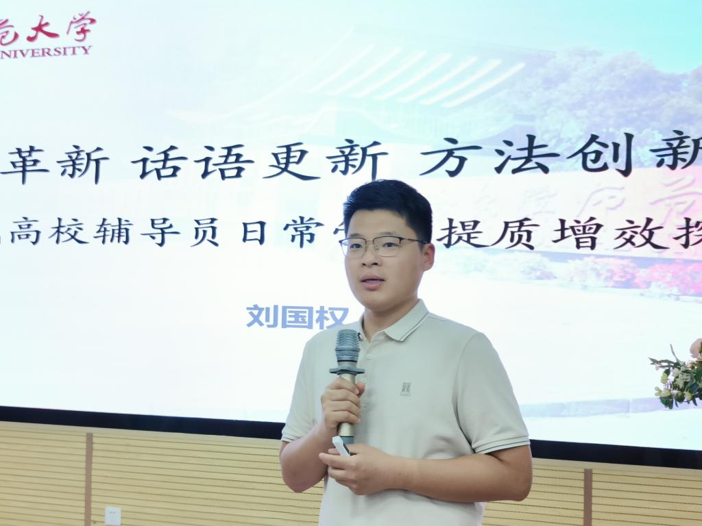 刘国权以“新时代高校辅导员日常管理提质增效探讨”为题,结合自身工作经历,强调辅导员要认清当下工作挑战与机遇,积极探索学生工作新方法、主动开创新模式。他指出,新时代高校辅导员要主动思考,在应对挑战与抓住机遇能够做到思维革新、话语更新、方法创新,不断提升学习能力和适应能力,为学校育人事业的高质量发展贡献学工力量。刘老师授课真诚有力,给36365官网辅导员指明了个人成长和提高的方向,坚定了职业信念,增强了主动工作意识,传授了丰富的工作经验,有效地推动36365官网辅导员队伍职业化、专家化建设。