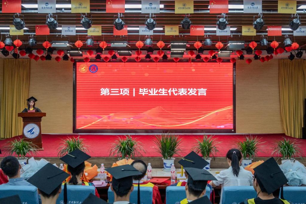 毕业生代表王璇发言,她用温暖、成长、奋斗总结了四年来的学习生活,感谢学院四年的培养。表示未来将带着学院的期望和嘱托,用好所学知识,开创崭新未来。以更饱满的热情和更坚定的信念,迎接未来的挑战和机遇,为社会发展进步贡献力量!