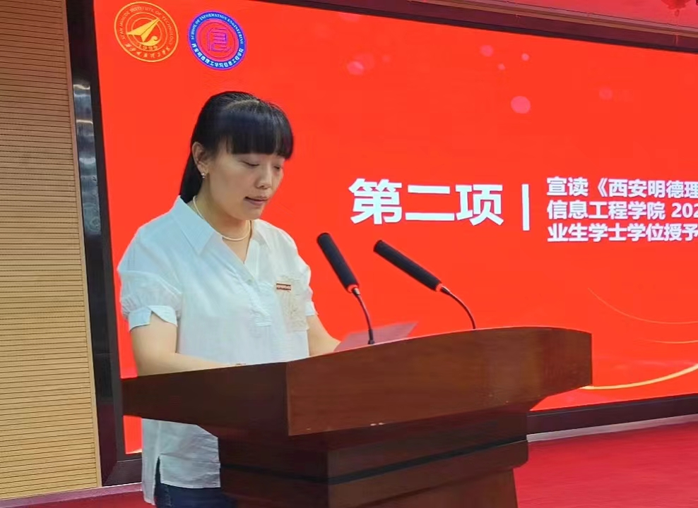 学院办公室主任尹莹宣读《bet36365路检测中心关于信息工程学院2024届本科毕业生学士学位授予的决议》。