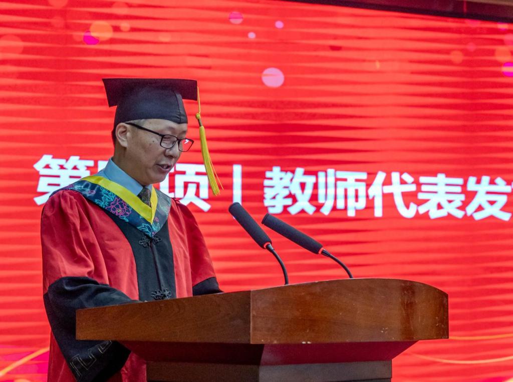教师代表陈世亮教授向学院圆满完成学业的毕业生送上美好的祝福。他希望同学们在新的起点铺就人生之路,更要相信时代、相信自己、相信未来。在逆境中成长,在面对困难时保持冷静,永远保持一颗求知的心和对学习的热情,不断探索、不断拼搏、不断进步,跟上时代的步伐,在信息技术这个快速发展的领域保持竞争力,同时时刻拥有一颗感恩的心,承担起历史赋予的责任和使命,成为国家栋梁之才,做永远向上的中国青年!