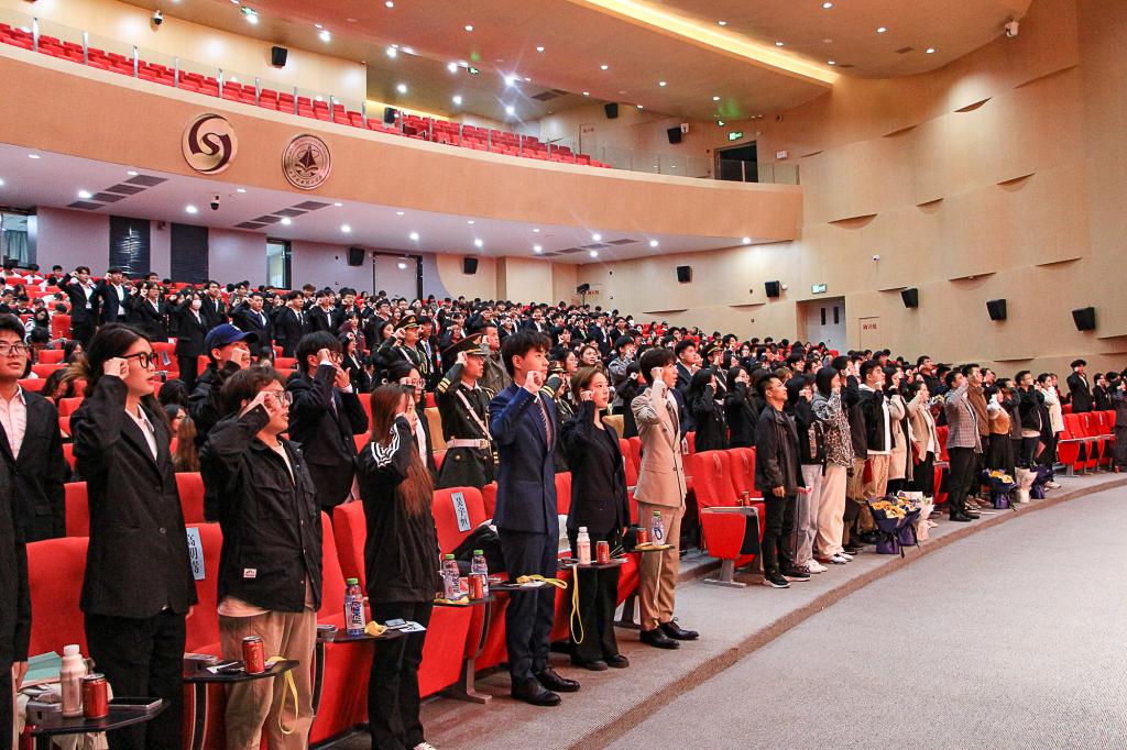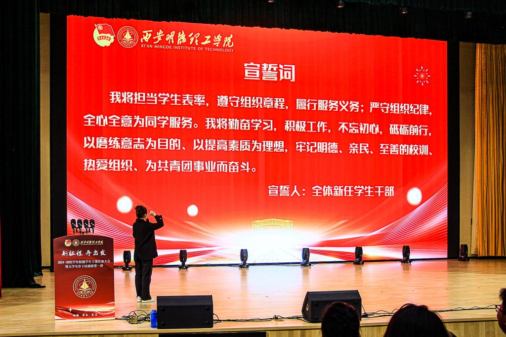 新任学生干部沈美晗带领全2024-2025学年校级学生干部就职宣誓:“以最为饱满的热情与认真负责的态度,为学校事业的蓬勃发展贡献力量”。