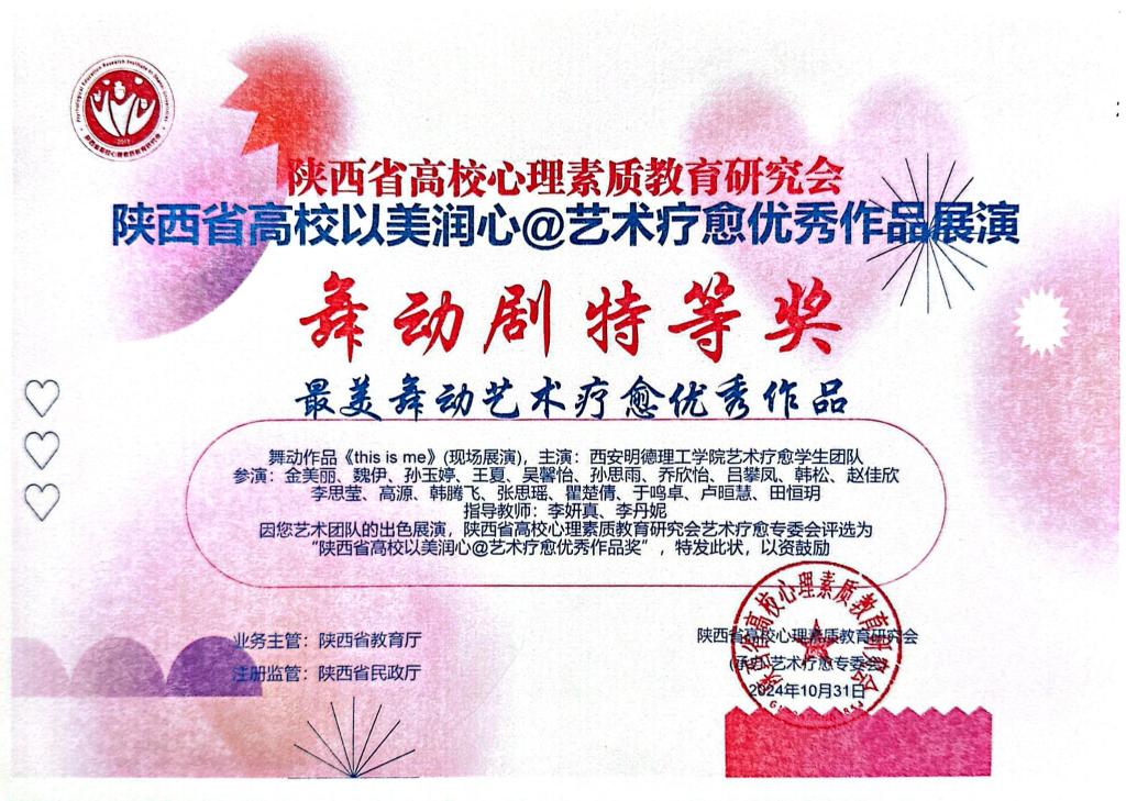 10月 31 日,陕西省高校以美润心艺术疗愈优秀作品展演在陕西艺术职业学院举行。学校报送的舞蹈作品《this is me》、声乐作品《明天你好》、器乐作品《高山流水》分别荣获舞动剧特等奖,音乐剧金奖和银奖等多项荣誉。
