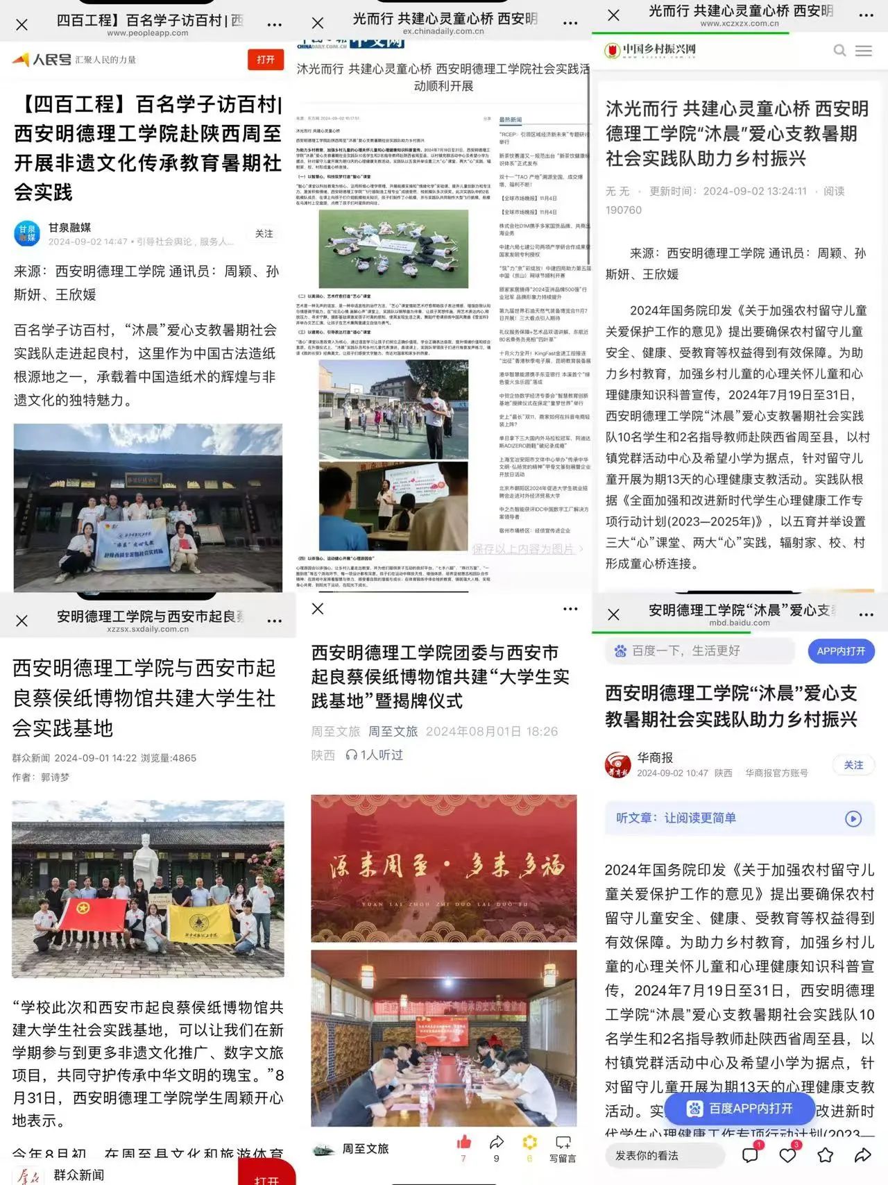 本项目通过乡村支教志愿公益课程让留守儿童能够去了解本土文化、传承文化,培养其道德,增强留守儿童文化认同感,坚定文化自信。其团队源于bet36365路检测中心22年历史的青年志愿者服务团沣河行动义务家教队,并在下乡活动中分化出“沐晨”爱心支教队,从2020年开始与周至县留守儿童之家——永新希望小学建立实践基地,并逐步形成了与服务当地的党政机关及团县委的“组织振兴之桥”、与驻村干部的“产业振兴之桥”、与驻点希望小学的“家校共育之桥”,与乡村文化保护点的“文化振兴之桥”。在这五年间“沐晨 童心桥”服务覆盖200+留守儿童,累计250课时,团队曾获得2022年暑期“三下乡”社会实践活动省级优秀团队,项目指导老师曾获得2023年陕西省暑期“三下乡”社会实践活动“省级先进个人”;活动曾在光明网、中华网、人民日报等多家媒体报道,其中国家级报道25篇,省级28篇,县级18篇,地方级48篇。“沐言晨语”自媒体传播相关新闻稿8篇、视频15条,媒体宣传累计50W+阅读量、10w +点击量、3w +点赞量。与当地团县委、文旅局合作,与起良村蔡侯纸博物馆共建实践基地,具有长期性和持续性,在乡村文化传承与儿童成长上具有积极社会效应。