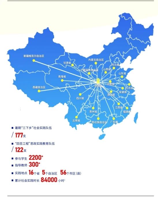 为深入学习贯彻习近平新时代中国特色社会主义思想、党的二十大精神及二十届三中全会精神,学习宣传贯彻习近平文化思想、习近平总书记五四青年节对全国广大青年寄语精神,深入推进学校“334”实践育人工作,按照上级团组织、学校党委的安排部署,2024年暑期,学校面向全校公开选拔2200余名学生、300余名教师、组建200余支团队云南、贵州、甘肃、广东等16个省,新疆、西藏等5个自治区,西安、广州、南京、延安等56个市区(县),开展了丰富多彩的暑期社会实践专项活动。