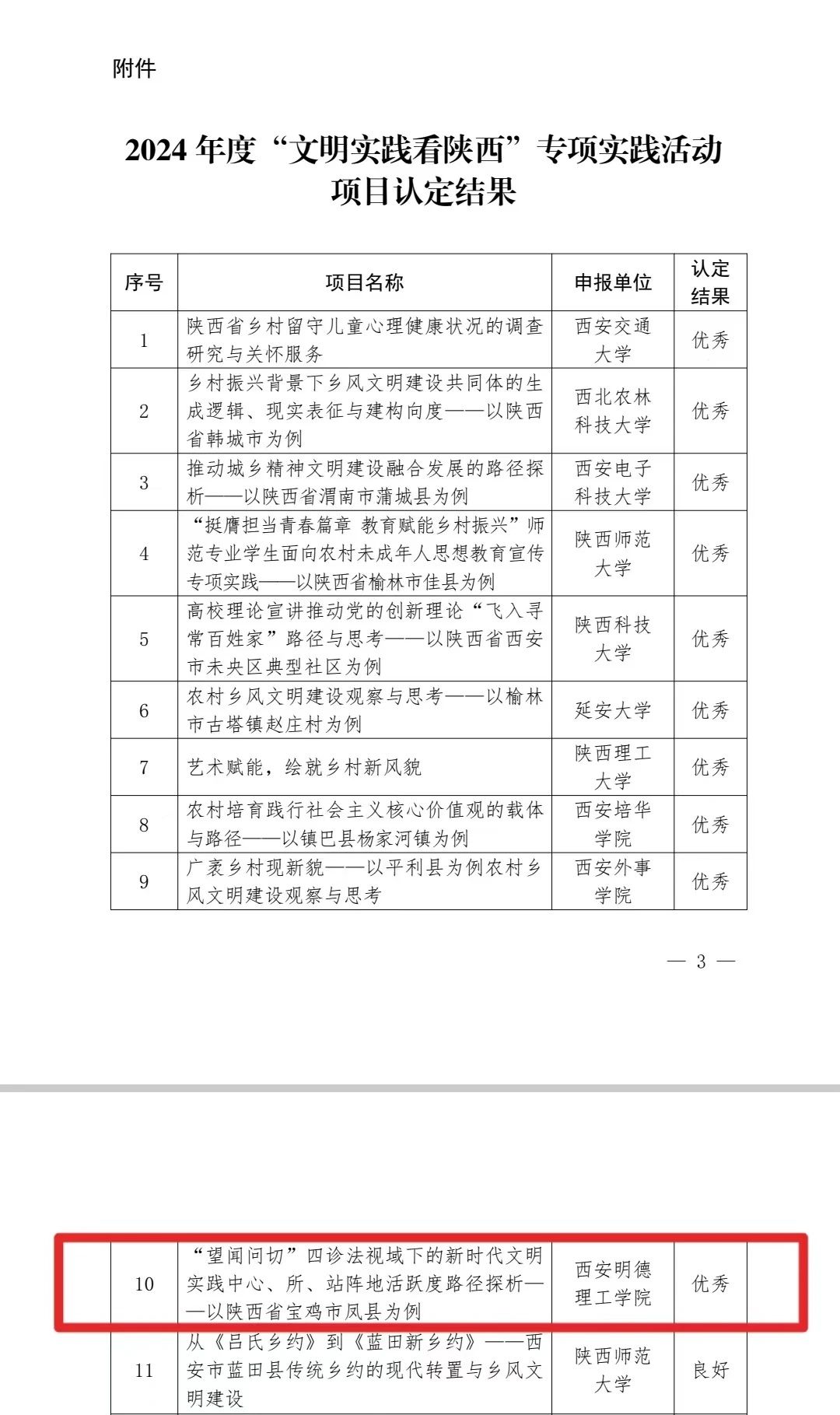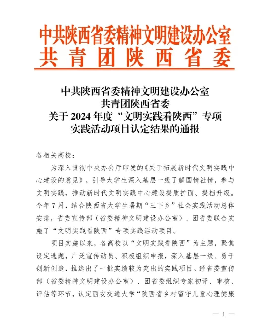 中共陕西省委精神文明建设办公室、共青团陕西省委公布的《关于2024年度“文明实践看陕西”专项实践活动项目认定结果的通报》中,36365官网《“望闻问切”四诊法视域下的新时代文明实践中心、所、站阵地活跃度路径探析—以陕西省宝鸡市凤县为例社会实践队》项目获得“优秀”认定结果。
