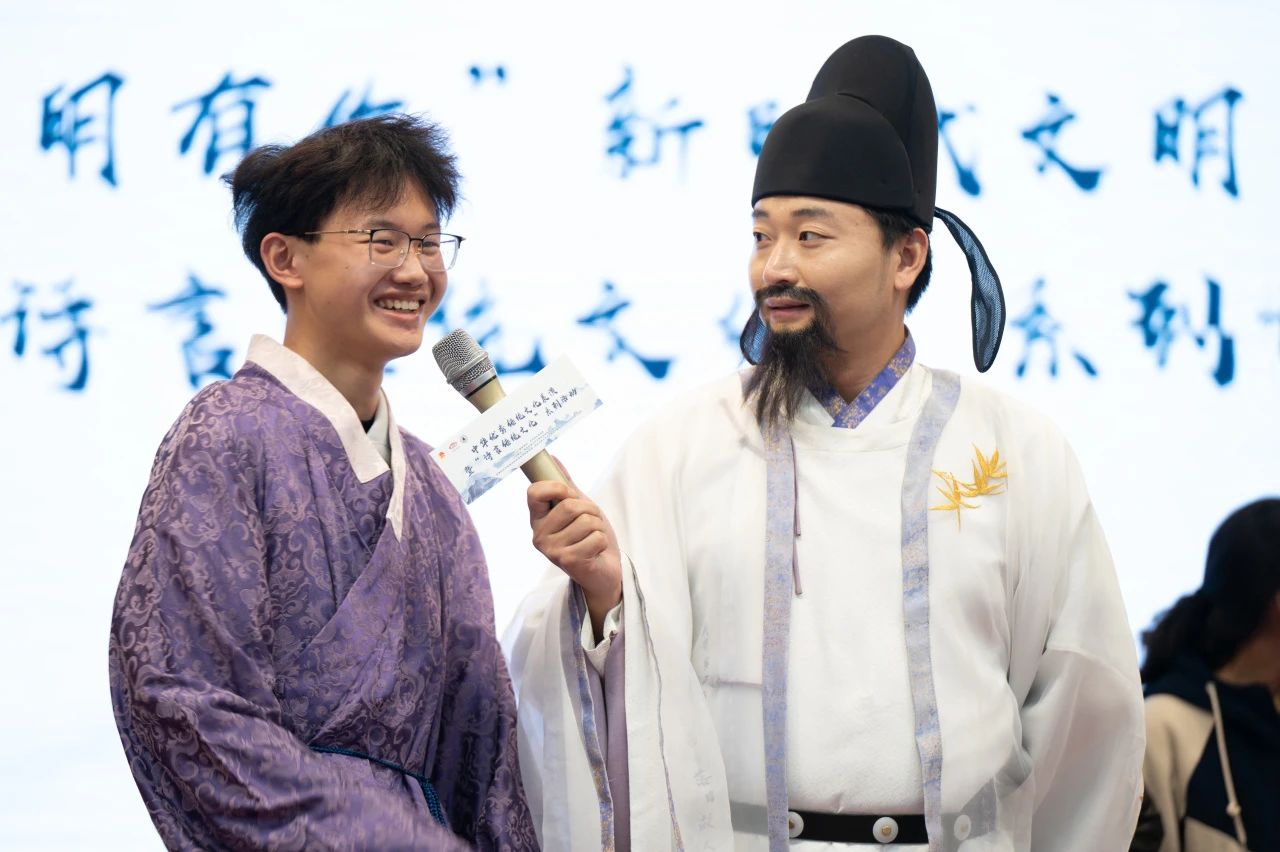 到了精彩的问答环节,同学们积极组队、踊跃上场,纷纷就诗词文化历史等方面与“诗仙李白”扮演者高鑫展开了激烈的对答,在轻松愉快的气氛中,进一步加深了对诗词文化的理解。得知明德学子喜爱《蜀道难》,诗仙李白便同大家一起朗诵了一遍《蜀道难》。