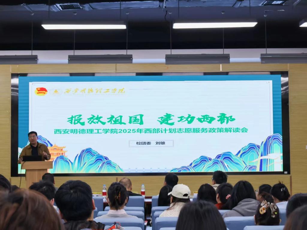 为深入贯彻落实国家关于大学生志愿服务西部计划的决策部署,引导广大青年学子投身西部建设、服务国家发展,3月26日下午,学校党委学生工作部、校团委、招生就业中心、毕业班年级组在建德楼202报告厅联合召开2025年大学生志愿服务西部计划政策解读会。相关部门负责人、各学院党委(党总支)副书记,全体毕业年级辅导员及2025届毕业生代表近200人齐聚一堂,共同聆听政策解读,感悟志愿精神,激扬青春理想。