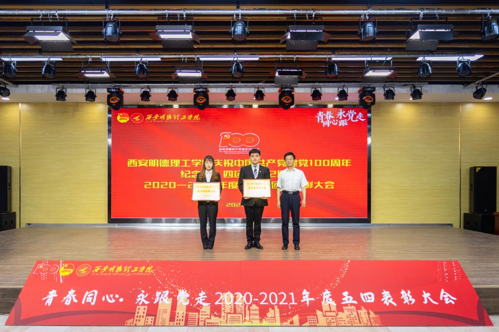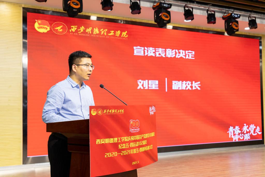 为深入学习贯彻习近平新时代中国特色社会主义思想,推进落实立德树人根本任务,深入开展党史学习教育,集中展示新时代明德学子的精神品格和价值追求,引导和激励全校各级单位、组织及师生学党史、强信念、跟党走,以优异成绩迎接中国共产党建党100周年。5月11日下午,学校在建德楼203报告厅举行了青春同心·永跟党走纪念五四运动102周年暨2020-2021年度五四表彰大会。校长杨健君、党委书记阎东明、副校长庾鲜海、王斌宁、党委副书记董昊、副校长刘星、财务总监马晓军、纪检监察工作负责人狄忠胜,各二级学院领导班子成员、职能部门负责人及受表彰学生代表等400余名师生参加了本次大会。
