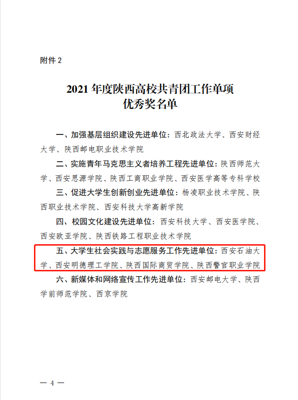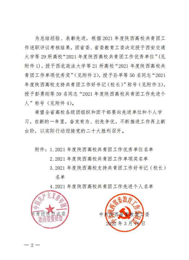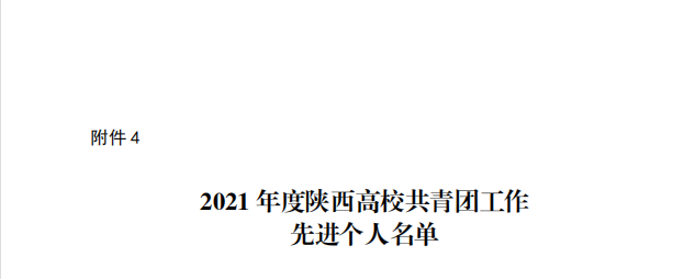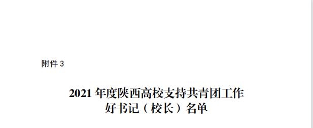 近日,共青团陕西省委、中共陕西省委教育工委联合发布了《共青团陕西省委、中共陕西省委教育工委关于2021年度陕西高校共青团述职评议考核结果的通报》,其中36365官网荣获“大学生社会实践与志愿服务工作先进单位”,校党委副书记董昊获“2021 年度陕西高校支持共青团工作好书记(校长)”荣誉称号,校团委副书记乔建获“2021 年度陕西高校共青团工作先进个人”荣誉称号。