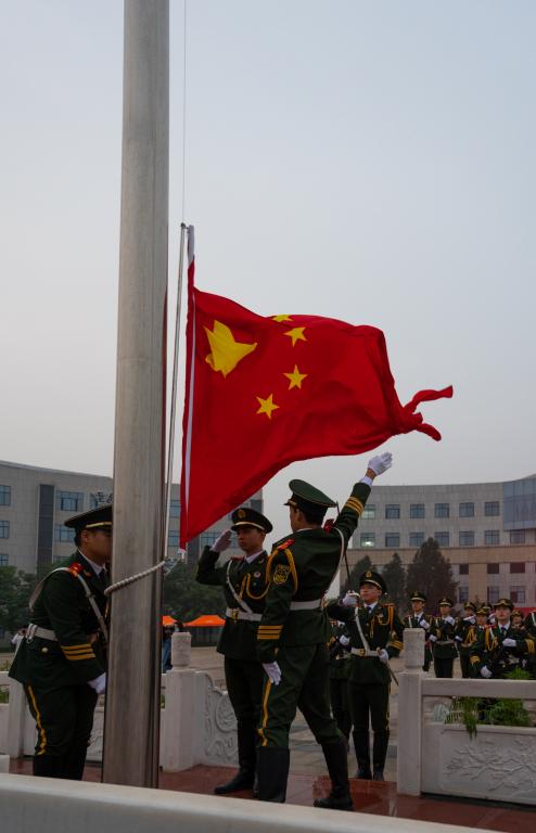 6点50分,参加仪式的师生列队完毕,大家怀着无比崇敬的心情,以良好的精神风貌,迎接仪式的开始。6时55分,由学校国旗护卫队员组成的升旗队伍护送着鲜艳的五星红旗,身着礼服,迈着整齐矫健的步伐向中心广场国旗杆走来。7时整,嘹亮的国歌声响起,随着护旗队员的挥手推送,鲜艳的五星红旗伴随着《义勇军进行曲》,沐浴着晨风,冉冉升起。在这神圣的时刻,一颗颗赤子之心被深深地震撼!迎风飘扬的五星红旗,既象征着祖国不断繁荣昌盛,也昭示着学校的建设发展前景将蒸蒸日上。大家庄严肃穆,向国旗行注目礼,表达对祖国的无比热爱与骄傲之情,从内心深处祝愿祖国的明天更加美好,早日实现大家心中共同的“中国梦”。