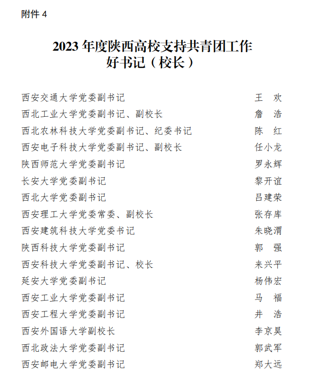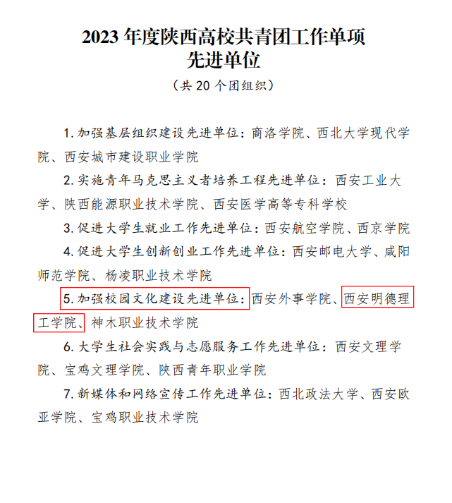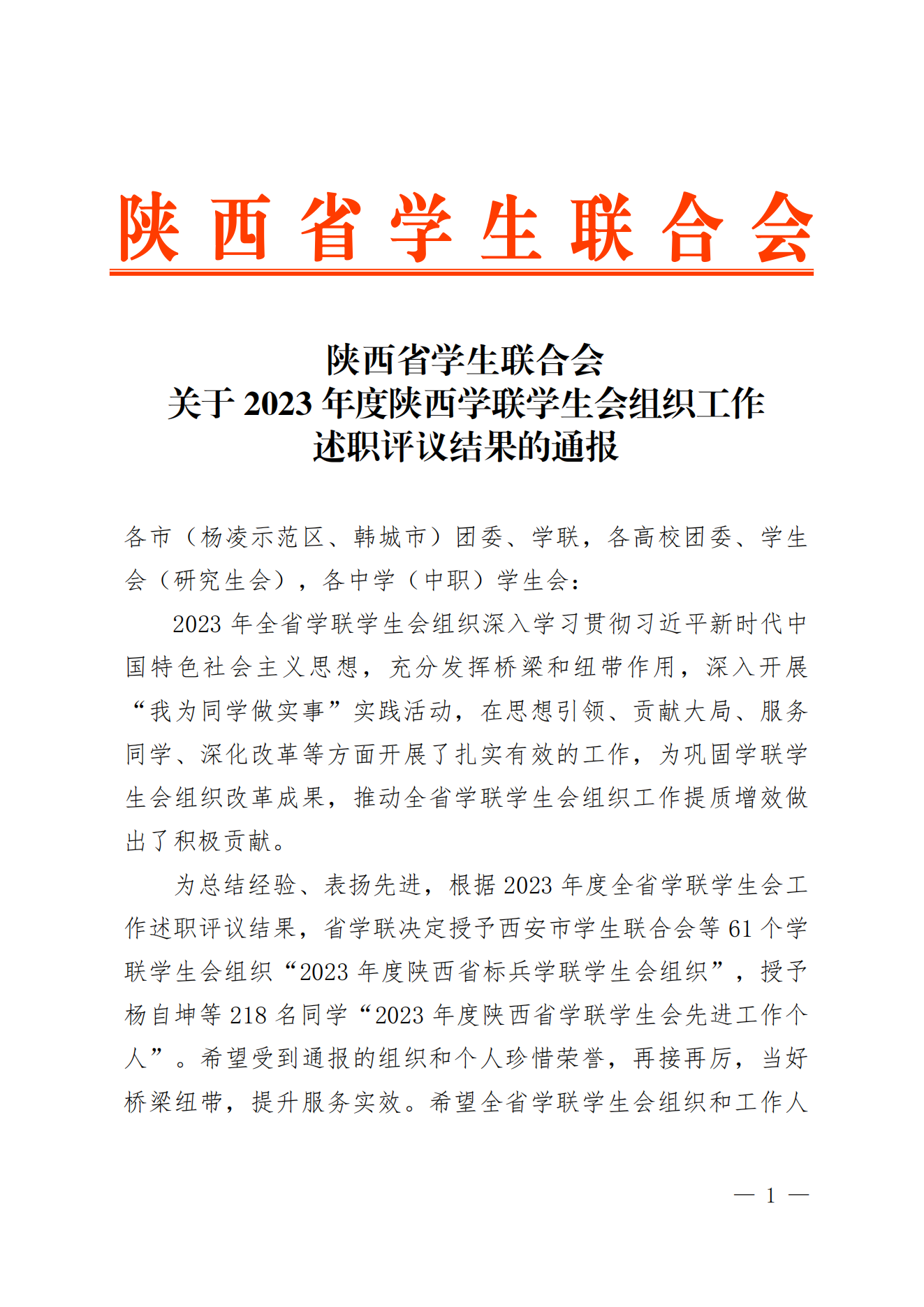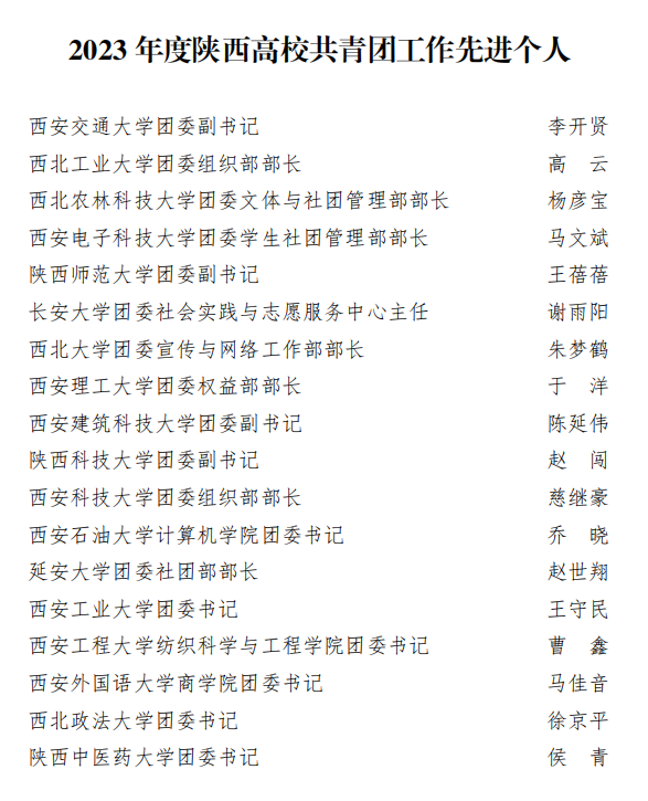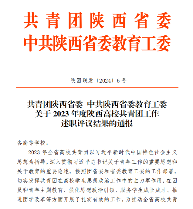 近日,共青团陕西省委、中共陕西省委教育工委联合印发《关于2023年度陕西高校共青团工作述职评议结果的通报》。36365官网荣获“2023年度陕西高校共青团工作单项先进单位”,校党委副书记、副校长刘星获“2023年度陕西高校支持共青团工作好书记(校长)”,校团委书记童杨梓荣获“2023年度陕西高校共青团工作先进个人”。陕西省学生联合会下发了《关于2023年度陕西学联学生会组织工作述职评议结果的通报》,36365官网学生会组织获评“2023年度陕西省标兵学联学生会组织”,学生会主要学生干部吕梦菲、王郑新迎获评“2023年度陕西省学联学生会先进工作个人”。