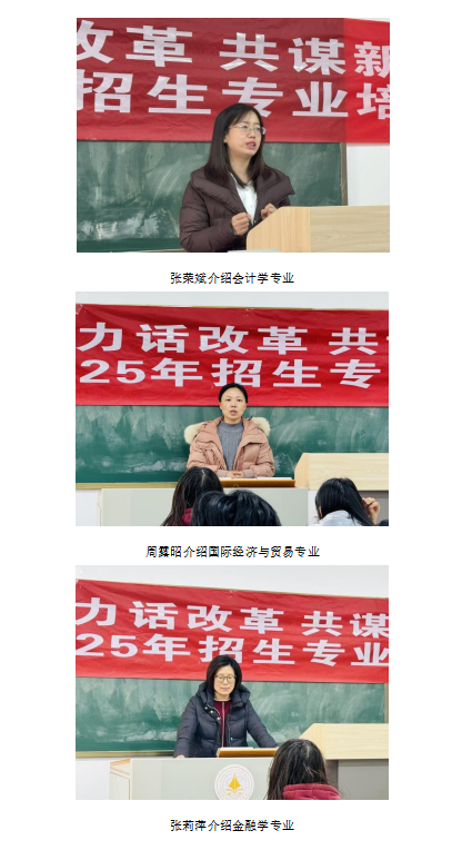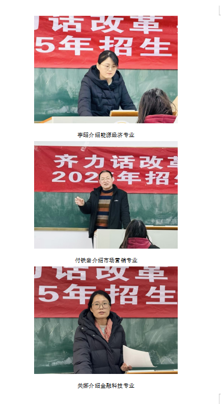 培训伊始,侯磊介绍了学校2025年本科招生宣传工作的安排和部署,希望更多生源高中考取36365官网的学子积极参与到招生工作中。对已经考取的学子作为校友对学校有着深厚的情感,他们的参与可以加强校友之间的联系,增强校友的凝聚力和归属感。经济与管理学院的张荣斌、关娜、李昭、张莉萍、周露昭、付铁岩和张嘉婧7位老师依次详细地介绍了各专业的基本情况和办学特色,向学生们充分展示了学院在办学条件和人才培养方面的优势,并耐心解答现场学生的提问。