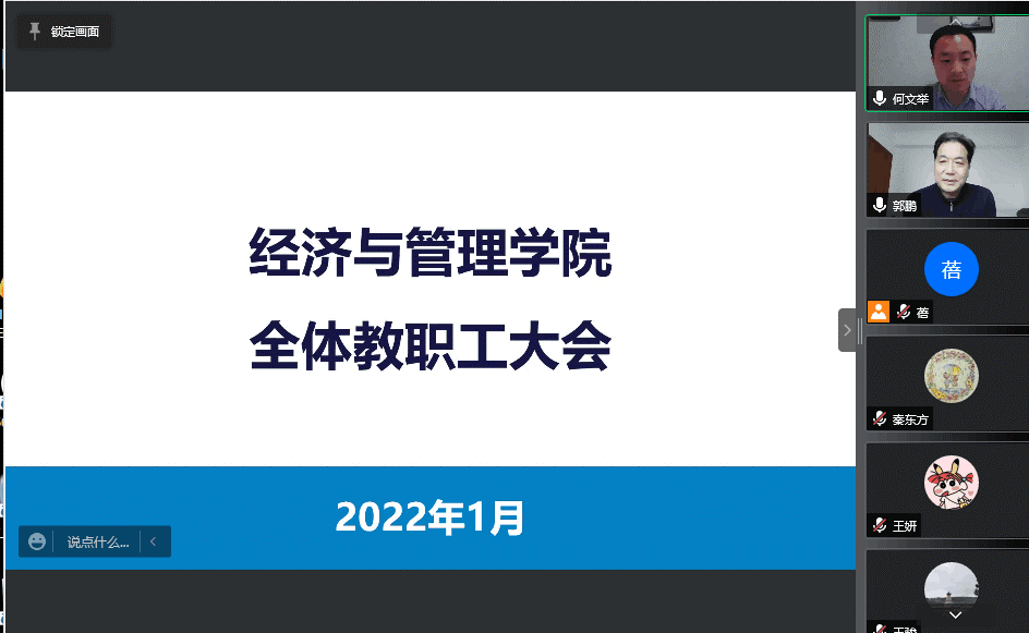 2022年元月27日上午,经济与管理学院在线召开全体教职工大会,经济与管理学院全体教职工参加,会议由学院党委书记兼行政副院长何文举主持。