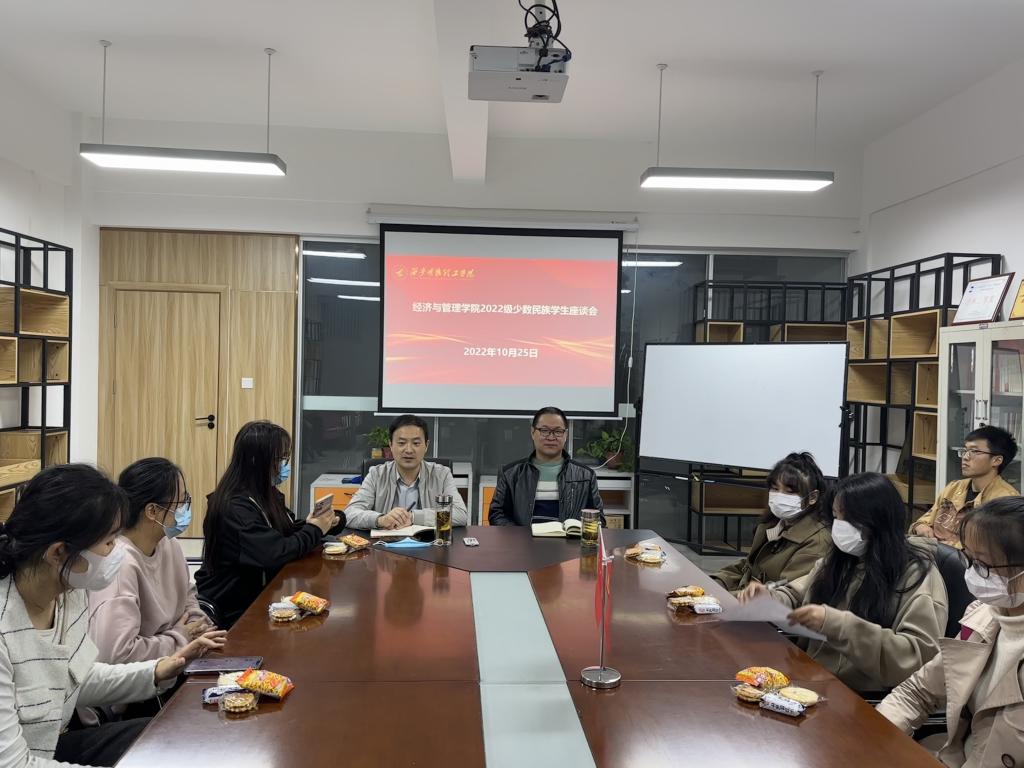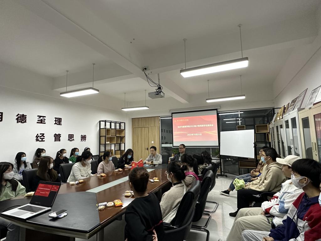 为深入了解少数民族学生疫情期间在校的生活、思想、学习情况,关心关爱少数民族学生成长,帮助少数民族新生更好地融入大学生活,促进民族团结融合。经济与管理学院于10月25--26日在明志楼北507召开少数民族学生座谈会,学院副院长付铁岩、2022级辅导员和新生少数民族学生参加了座谈。座谈会由学院党委书记兼行政副院长何文举主持。