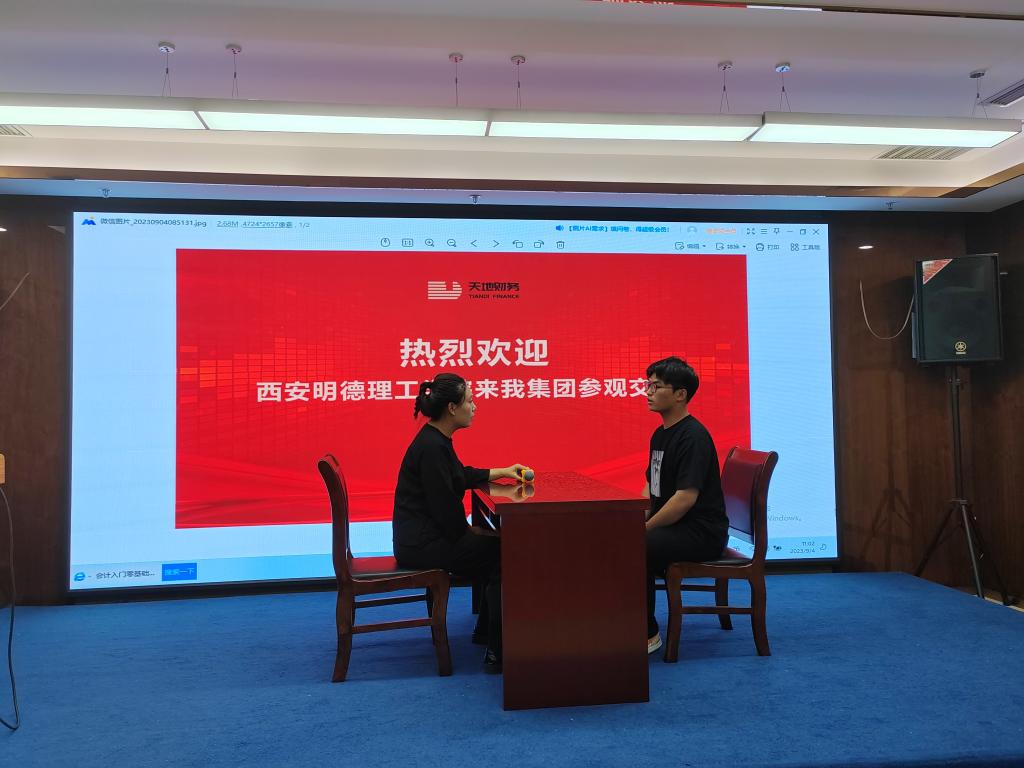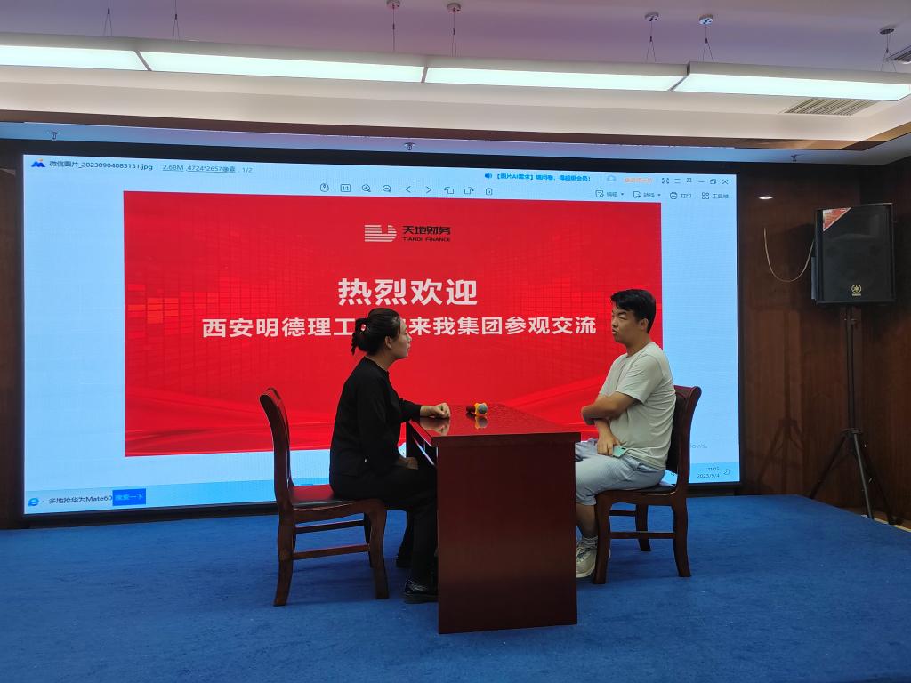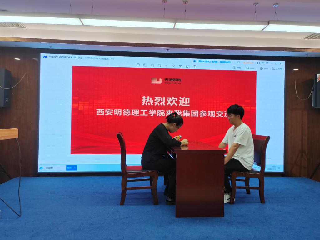 在研习过程中,陕西天地财务集团有限公司副总裁韩总及人力资源部门负责人对学院师生一行表示热烈欢迎。并带领同学们集体观看了集团宣传片。
