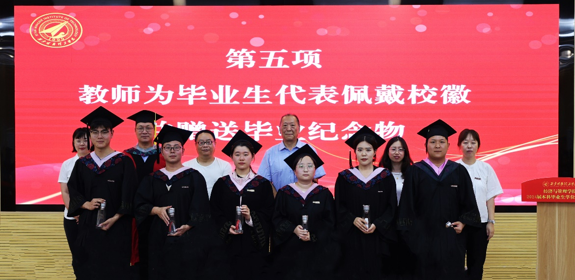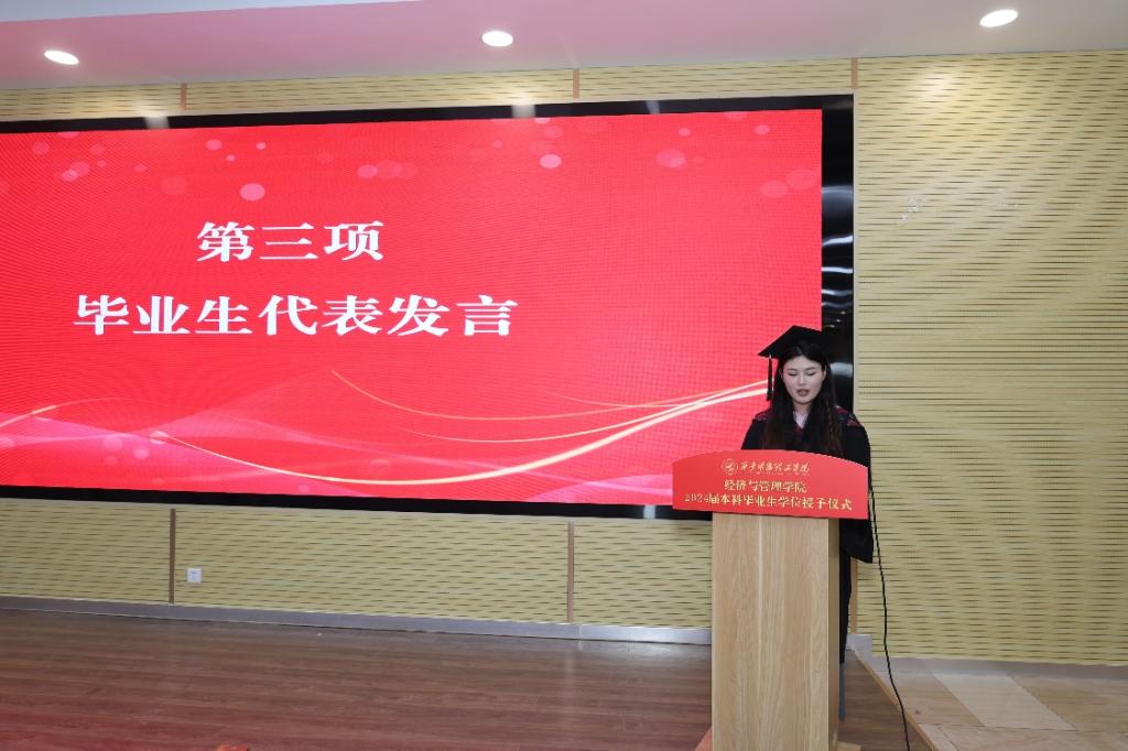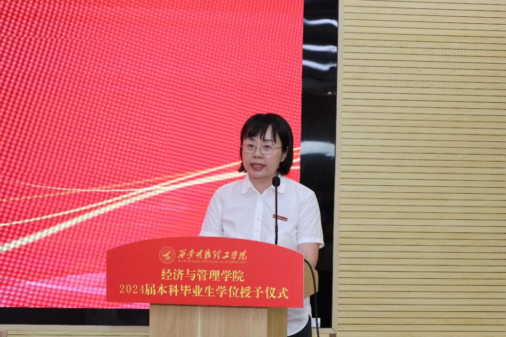 校级教学名师、师德标兵、陕西省一流课程负责人国际经济与贸易专业教师解蕾副教授作为教师代表进行了发言,她代表学院全体教师对2024届毕业生们表示热烈祝贺,在经济与管理学院能够见证学生们的成长与蜕变,老师们深感自豪。在离别之际,她希望学生们保持那份对知识的渴望,对梦想的追求,对生活的热爱,鼓励毕业生以勇敢的姿态迎接未来的新挑战。