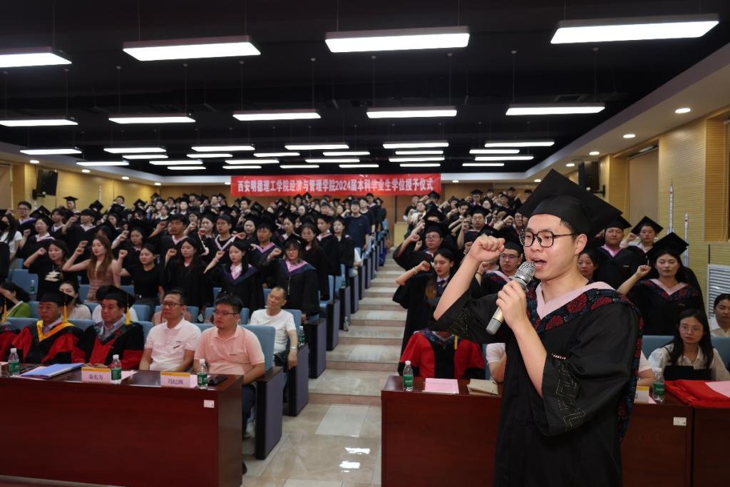 随后,与会校院领导、教授代表为现场的毕业生颁发学位证书,并为毕业生们拨穗正冠,合影留念。随着大学生涯的结束,同学们开启了人生新的征程,愿经济与管理学院2024届全体毕业生此去繁花似锦,再相逢依旧如故。6月25日下午,经济与管理学院2024届本科毕业生学位授予仪式在建德楼201隆重举办。学校党委副书记、纪委书记、副校长白秦川,经济与管理学院院长郭鹏、党委书记兼行政副院长何文举、副院长许萍、副书记冯纪潮及各专业负责人、教师代表、家长代表、2024届毕业生共同见证了这一重要时刻。学位授予仪式由何文举主持。