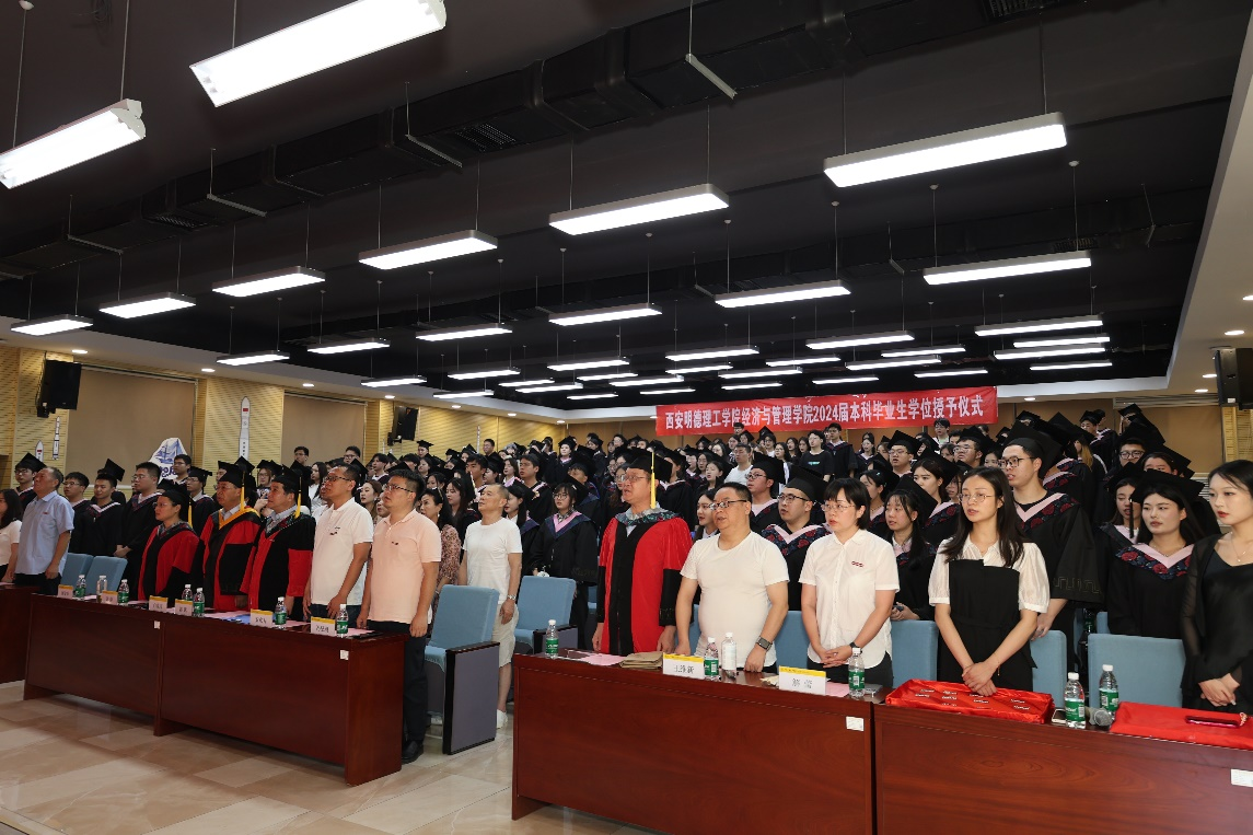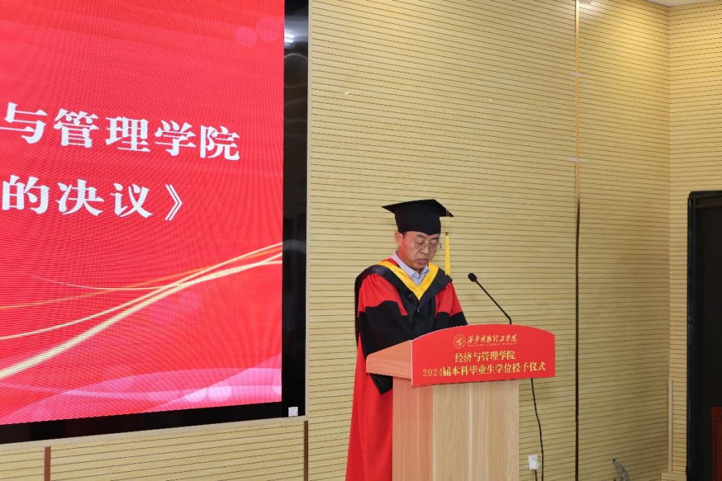 仪式在全体师生齐唱国歌后,正式拉开帷幕。校党委副书记、纪委书记、副校长白秦川宣读了《bet36365路检测中心关于经济与管理学院2024届本科毕业生学士学位授予的决议》,他对2024届同学们顺利完成学业,开启人生的新篇章表示由衷的祝贺。