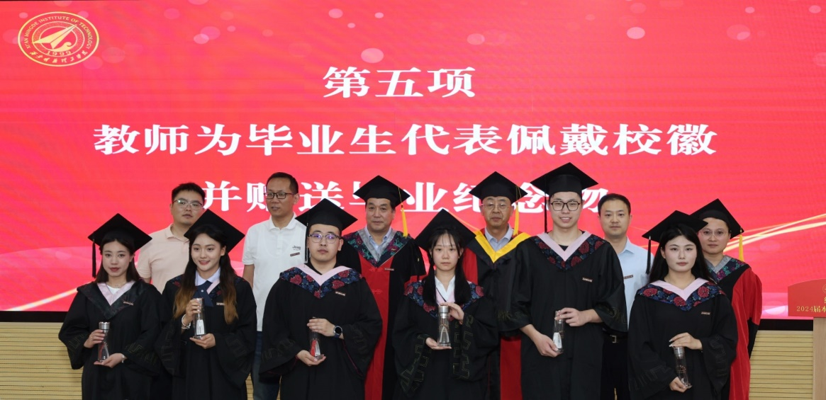 校院领导和教师代表为毕业生代表佩戴校徽并赠送学院为毕业生定制的水杯纪念物,希望毕业生饮水思源,懂得感恩回报。